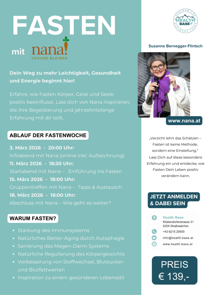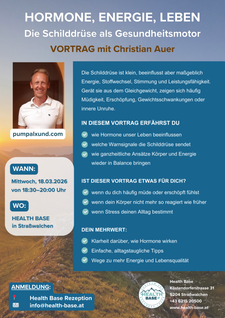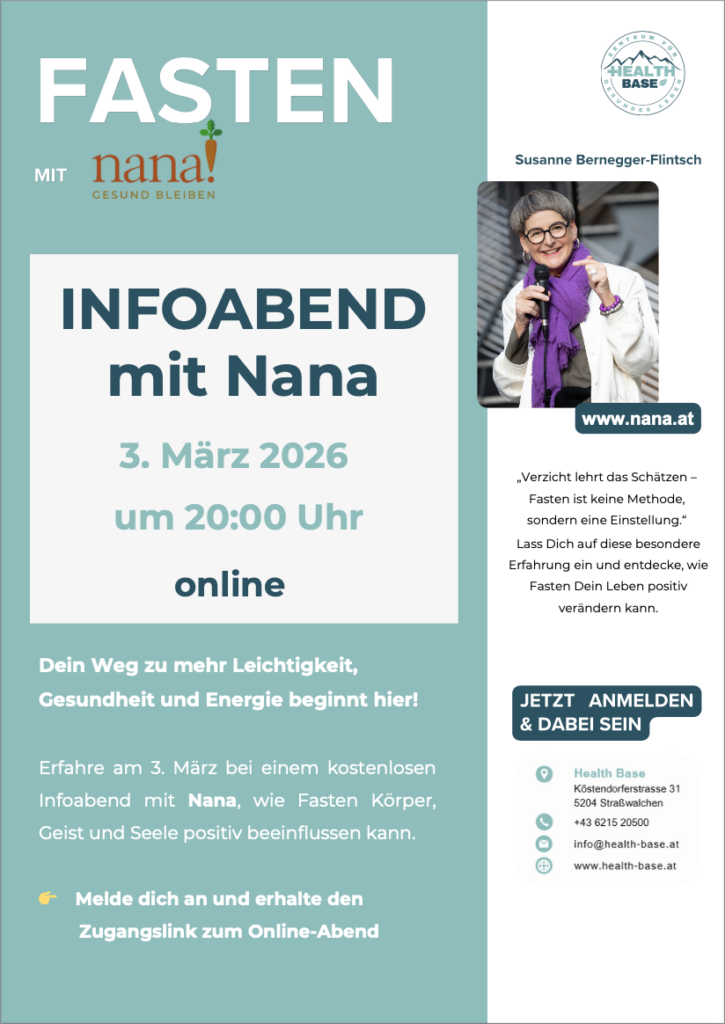 Melden Sie sich jetzt für unseren WhatsApp-Newsletter an, indem Sie eine E-Mail an info@health-base.at senden. Erhalten Sie regelmäßige Gesundheitstipps, Neuigkeiten und exklusive Angebote direkt auf Ihr Handy!